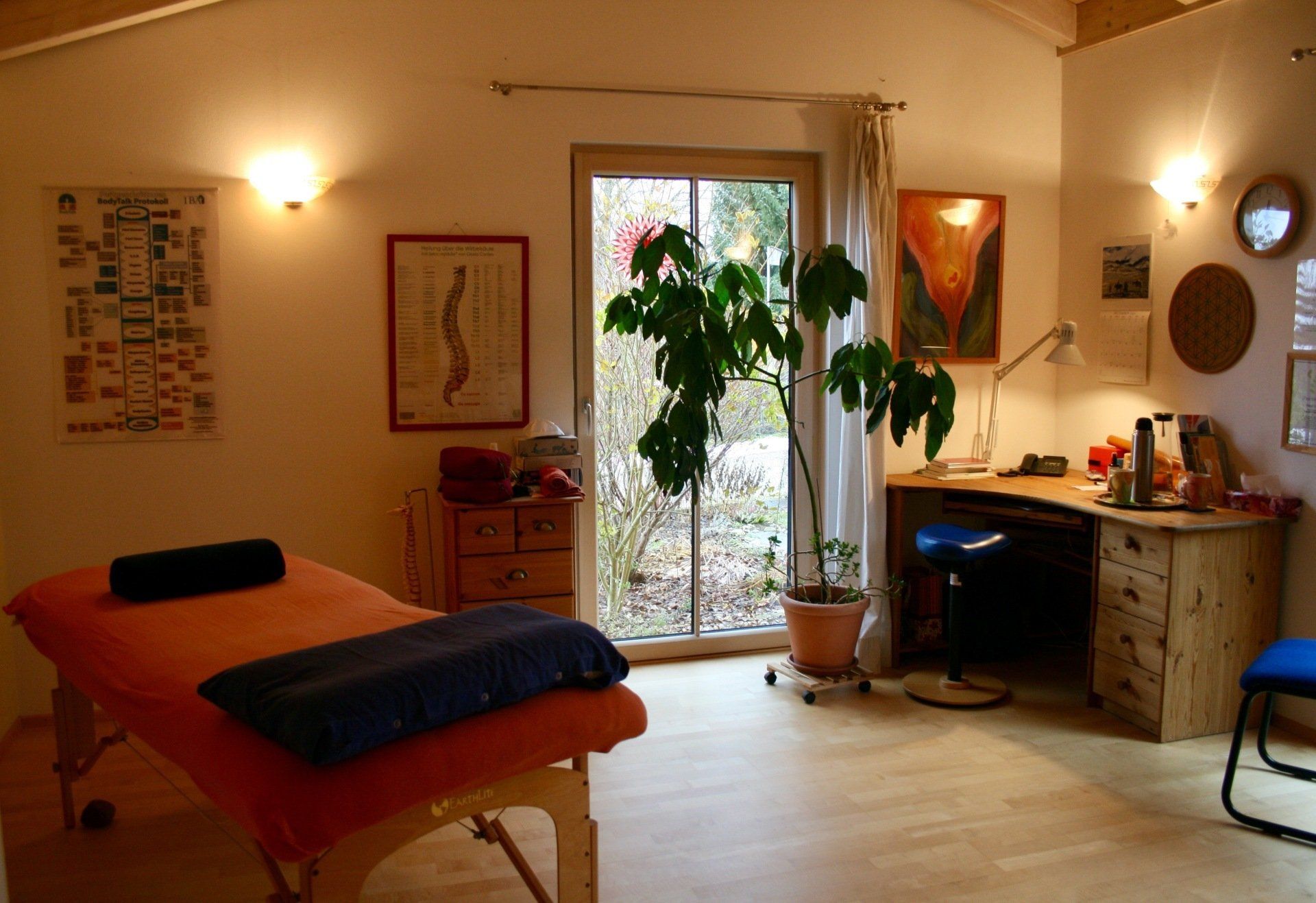 Ca. 30 m nach der Kreuzung in der Ortsmitte (Gasthaus Wiedmann auf der linken Seite) biegen Sie nach rechts ab in die Dominikus-Zimmermann-Straße (dort befindet sich ein Schild der Praxis und zum Sportplatz) und nach ca. 100 m - direkt hinter dem Gemeindeparkplatz - in den Kiesweg links abbiegen.